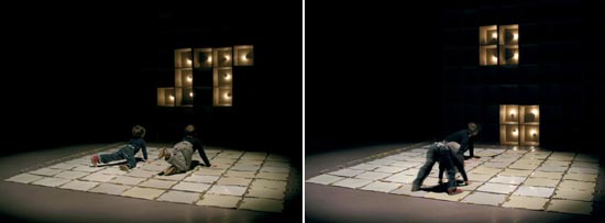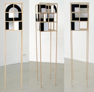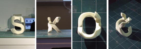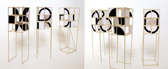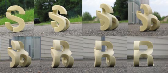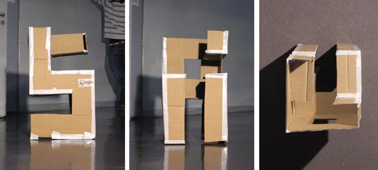 thomas bernard is a paris based graphic designer is also a member of the graphic collective think experimental. his work experiments with type and graphics in a variety of interactive ways. 'dancekarpet' is a project which u ses a 'twister' like floor interface which corresponds to a 1:1 scale screen made from light boxes. when the user dances or moves on the floor the screen in front lights up the appropriate pixel. other projects include 'mutinerie' a notebook with deceiving lines on the inside. his 'polygraph system' uses a 3d box to create different letters forms depending on the viewer's angle. similarly he has also designed a number of small letter forms that combine multiple 2d letters into a three dimensional form called 'typographies anamorphotiques'.